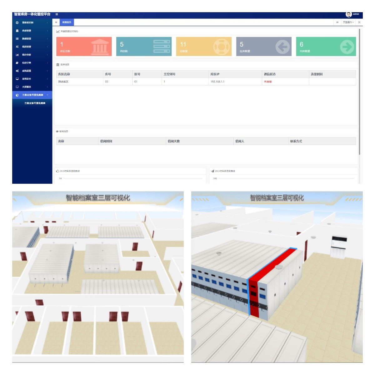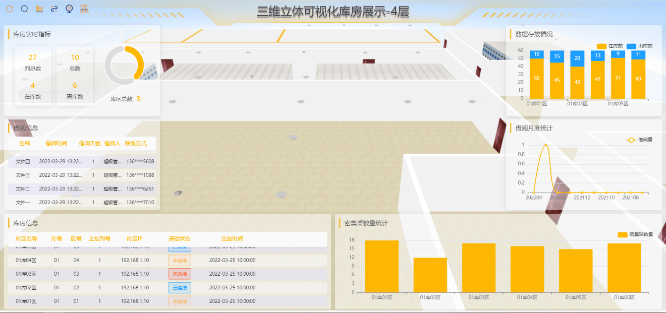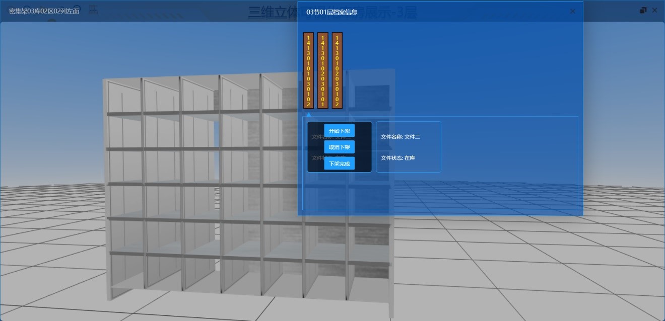 本系統(tǒng)結(jié)合用戶的深度業(yè)務(wù)邏輯,通過Three.Js三維可視化技術(shù)搭建數(shù)字孿生模型,使用IOT技術(shù)、運(yùn)行歷史數(shù)據(jù),多尺度、多概率的仿真過程,在虛擬空間中完成映射,將真實(shí)設(shè)備與數(shù)字模型進(jìn)行耦合交互,實(shí)現(xiàn)設(shè)備實(shí)時(shí)運(yùn)行狀態(tài)與數(shù)字孿生對象動作對應(yīng)(支持密集架開啟、關(guān)閉、查詢文件等)。