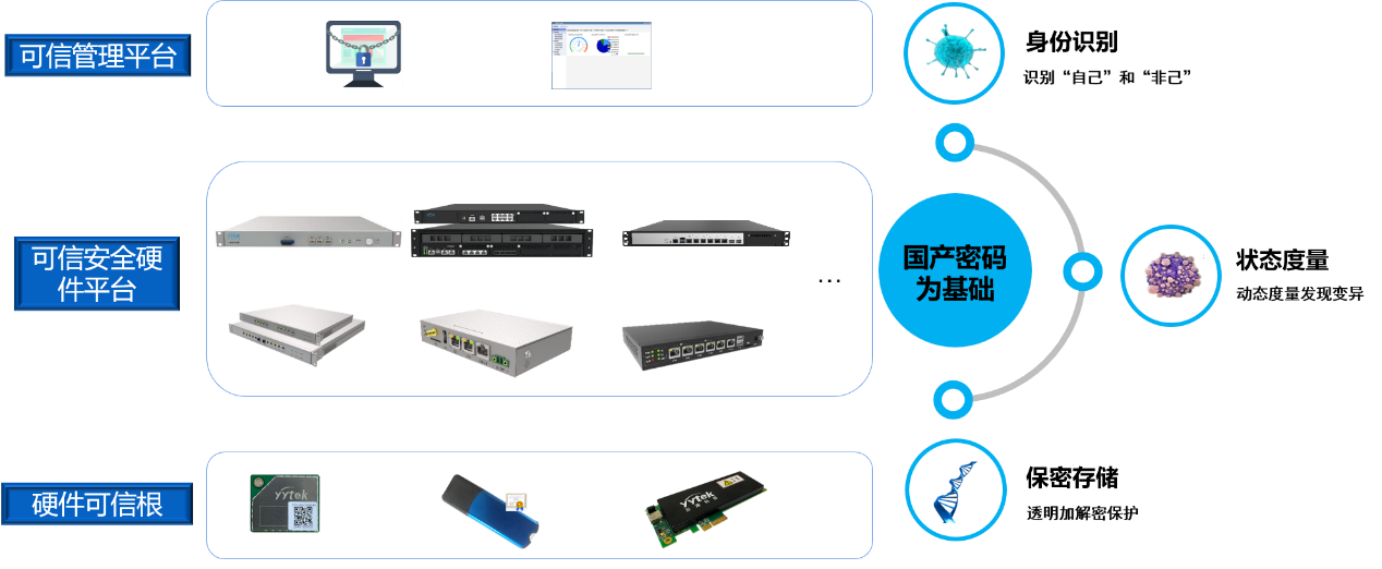 云涌可信計算平臺以可信計算為核心技術(shù),采用“計算+保護”雙體系結(jié)構(gòu),對通用計算部件(包括通用硬件和固件、操作系統(tǒng)、應(yīng)用軟件及服務(wù))進行度量和控制,為現(xiàn)有系統(tǒng)構(gòu)建可信環(huán)境,實現(xiàn)自主防御,抵御未知木馬、病毒以及0day攻擊。此外,云涌還基于可信計算核心思想和基本架構(gòu),依據(jù)等級保護2.0要求,結(jié)合自身在工控安全領(lǐng)域多年來的軟硬件技術(shù)積累,打造出硬件可信根和可信安全硬件平臺等系列產(chǎn)品,全面守護底層到硬件層,乃至應(yīng)用層的系統(tǒng)安全。