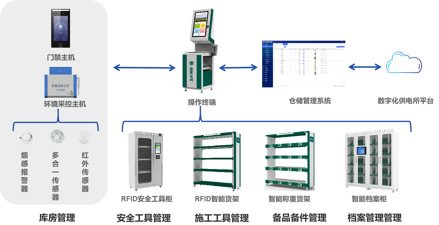 此外為了更好的實現自動控制、智能照明、安全防護以及數據分析,針對供電所“四庫“的室內存儲環境管理,我們配有一整套專門的庫房管理系統,以及系統配套的輔助設備,比如操作終端、RFID通道門和標簽等,并結合使用基于物聯網、云計算等新技術構建的智能一體化管控平臺,系統管理員不僅可以實現對多個庫房的站點管理,還能獲得更加智能化、多元化的管理解決方案。