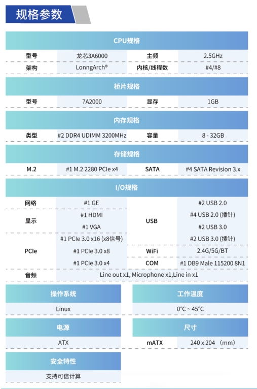 由云涌科技推出的基于3A6000的系列產品,采用4核處理器構建,主頻2.5GHzo,搭配7A2000橋片,1GB獨立顯存,支持2路UDIMM3200DDR4內存條,支持M.2接口,可作為小容量固態系統盤使用,應用于家用娛樂、商務辦公等場景。